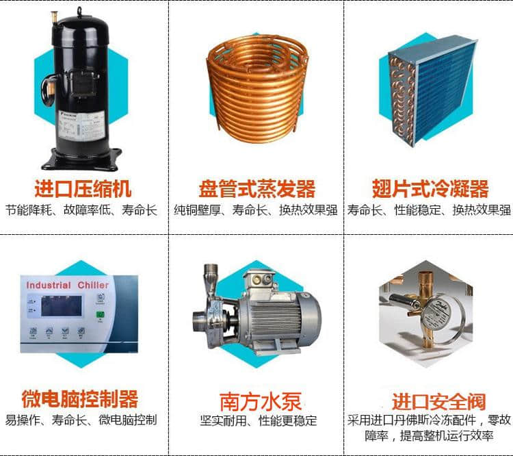 一体式冷水机则以密闭箱式结构,将冷凝器、压缩机、蒸发器、温控器、水箱、泵浦、管道、电气控制线路等合理的设计安装在机架内部,外部以不锈钢等材质的挡板保护,浑然一体。