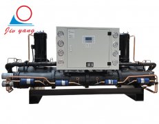 低温风冷式冷水机工作原理,由压缩机蒸发制冷后的低压制冷剂气体,然后经过冷凝器冷却转化为常温液体,然后经过膨胀阀节流成低温低压湿蒸汽,流入蒸发器,因为蒸发是吸热过程,蒸发器里的溶液(槽液)就会被降温,从而实现被冷却设备(管道)的冷却,完成一个循环过程。